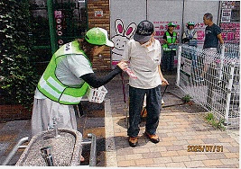 夏の地域安全運動期間中、7月18日、地区内のフードマーケットフジサキ周辺において、街頭キャンペーンを実施しました。活動では、買い物客やその周辺の市民の皆さんに対し、啓発用品を配付しながら、特殊詐欺被害防止を呼びかけ注意喚起を行いました。活動により、地域の皆さんの防犯意識の高揚を図ることが出来ました。