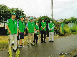 みずほ台分会は、8月9日、高齢者世帯に対する特殊詐欺被害防止活動及び安全点検パトロールを実施しました。活動では、特殊詐欺の被害が多発していることから町内の高齢者世帯がいる戸建てを中心に、特殊詐欺被害防止のチラシや啓発用品を配付し、被害に遭わないよう注意喚起を行いました。活動中に町内で会った高齢者には、特殊詐欺の被害に遭わないよう声を掛けました。同日、町内の公園や道路の安全点検も実施しました。
